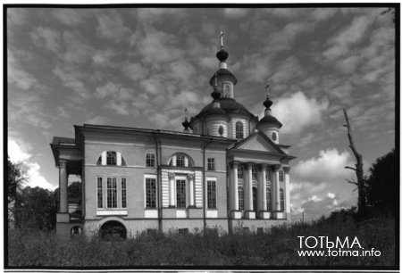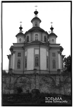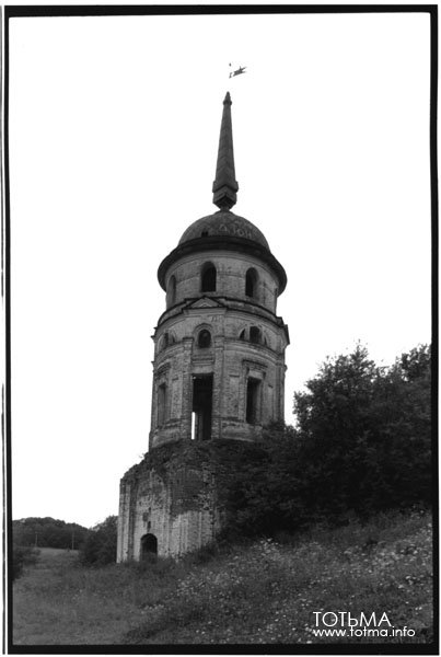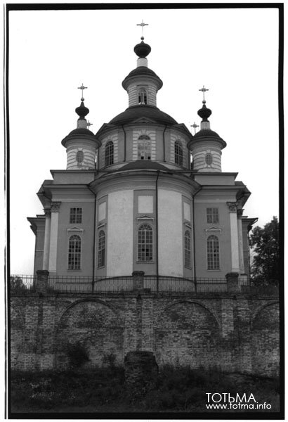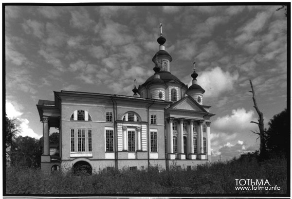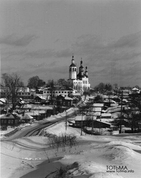 Неважно, каким путем Вы приезжаете в Тотьму - через волнистые поля и леса или по широкой долине реки Сухона - в любом случае появление этих высоких церковных башен среди окружающего ландшафта вызывает чувство изумление. Я путешествовал по Тотемскому району в жаркие летние утра, когда силуэты церквей парят над окружающими полянами. Но, по моему мнению, Тотьма лучше смотрится зимой, например, в морозный солнечный день (30 градусов), как это было в начале января 1997 г., когда церковные башни пробивались сквозь ледяной туман и дым из сотен деревянных изб, прикрытых снегом.