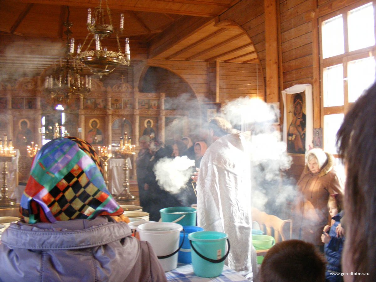 19 января,в крещение уже после освещения воды в Тотьме, Бабушкине, и ночной службы в храме о.Георгий направляется на освещение воды в п.Юбилейный в храм Вассиана Тиксненского,народ уже ждал, но из-за разбитого асфальта не уторопишся.