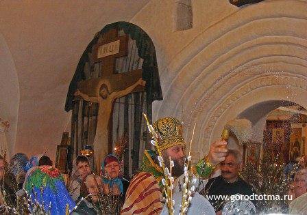 Множество народа скопилось в храме Рождества Христова с ветвями вербы, (так как они заменили пальмовые, с которыми встречали жители Иерусалима Христа) встретить праздник,всем не хватало места, народ стоял даже на паперти.