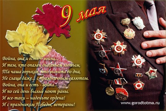 День Победы по праву относится к самым ярким и торжественным страницам истории нашей страны. Это была Победа в войне, ставшей самым суровым испытанием для жителей России и всего мира. Слова благодарности мы адресуем вам, поколению Победителей, отстоявших свободу, подаривших мир народам и странам, жизнь будущим поколениям. Низкий вам поклон за то, что вы выстояли в той страшной войне и восстановили израненную страну. Спасибо вам за активную гражданскую позицию в воспитании новых поколений.