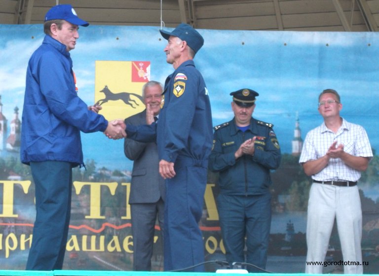После этого участники экспедиции отправились в Тотьму. Город музеев и мореходов встретил их ярмаркой, раскинувшейся на городской площади. С напутственным словом в адрес жителей города выступили руководитель Экспедиции Владимир Кудрявцев и начальник управления кадров Северо-Западного регионального центра МЧС России полковник Альберт Петрович Пикалюк. На городской сцене были отмечены ведомственными наградами сотрудники МЧС города Тотьмы. Знаками отличия МЧС России были награждены глава МО «Медведевское» Татьяна Александровна Воропанова, водитель пожарной части отдела охраны г. Тотьма Александр Михайлович Котнёв, частный предприниматель, бывший начальник (до 2008 г) ПЧ-37 Владимир Владимирович Макаров.