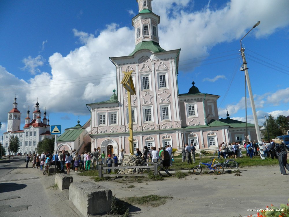И люди сделали это! Участников оказалось достаточно, чтобы окружить храм – это единственный в центре храм, который позволяет обойти его вокруг. Неподалёку находится жемчужина Тотьмы – Входоиерусалимская церковь, красивейший храм, построенный в стиле «тотемского барокко».