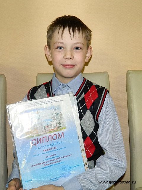 Одним из победителей заочного этапа конкурса стал юный тотьмич — четвероклассник средней школы № 3 Егор Фокин. Летом он был в водном походе по реке Сухона, по результатам которого получил 3 юношеский разряд по водному туризму. Иллюстрированный рассказ о водном маршруте «Остров Дедов — Опоки» Егор представил на конкурс в виде компьютерной презентации. Его работа получила диплом I степени в номинации «Мое путешествие».