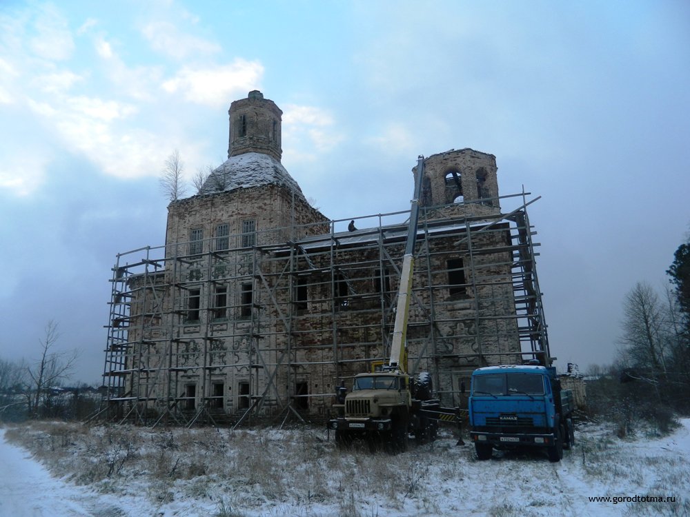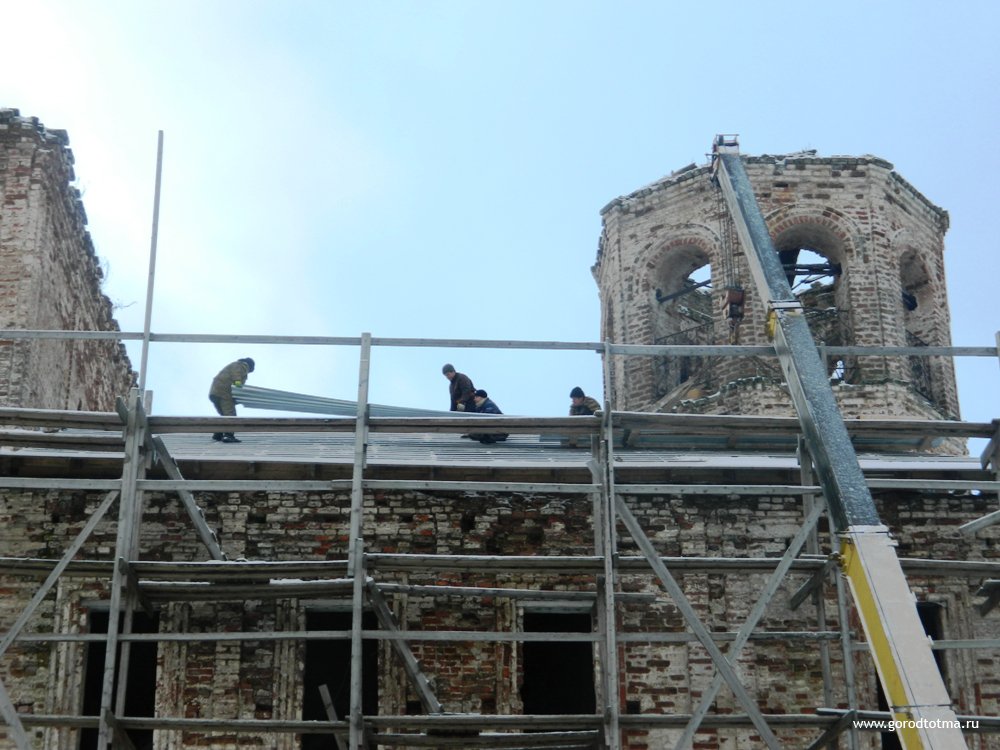 Самое главное - уберечь храм от разрушения, ведь несколько лет назад там случился пожар и сгорела крыша. А без кровли храм начал стремительно рушится. Поэтому первая задача – построить новую крышу и законсервировать здание церкви. Сделали деревянную обрешётку, недавно её покрывали листовым железом. Из-за дождливой затяжной осени работы долгое время откладывались, но накануне зимы всё же успели покрыть крышу рабочие ООО «СПЕКТР» (директор Николай Трофимов).