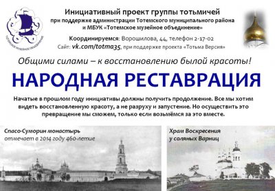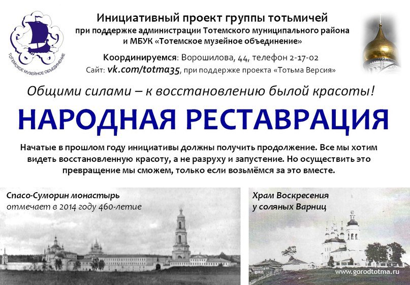 Если Вам хочется видеть тотемские храмы и дома в первозданной красоте, Вы желаете бескорыстно помочь городу и чувствуете, что готовы это делать – давайте объединимся! Тем более, что тотьмичи уже доказали, что могут это.