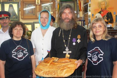 По доброй традиции, вологжане преподнесли путешественнику вологодское масло, тотемские пряники и каравай, на котором мастера тотемского хлебокомбината ювелирно выпекли весельную лодку и фигурку самого путешественника.
