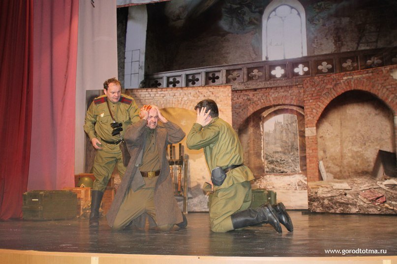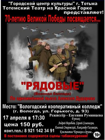 Сегодня - 17 апреля – Тотемский Театр на Красной Горке (Городского центра культуры) выступит в Вологде со спектаклем «Рядовые» по одноимённому сценарию Алексея Дударева.