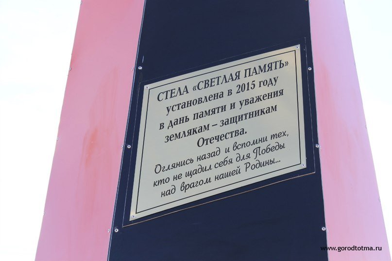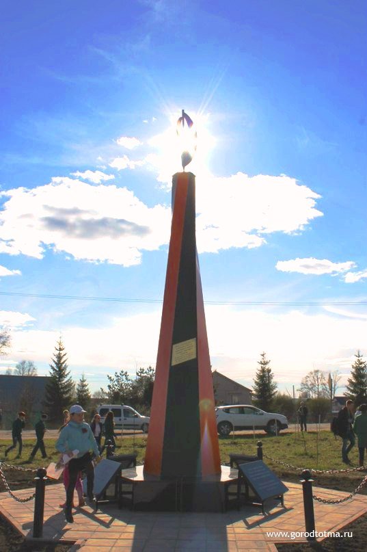 Памятная стела посвящена землякам – участникам всех войн и локальных конфликтов за прошлое столетие: Первой мировой, Великой Отечественной, участникам Афганской и Чеченской войн. Чтобы её построить и установить, тотьмичи собирали деньги всем миром.