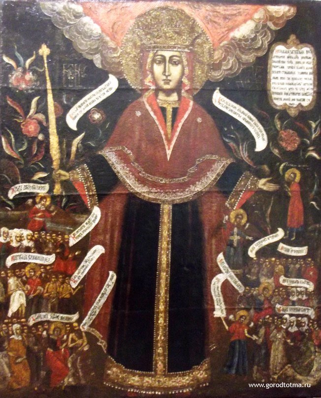 Икона Богоматери «Всех Скорбящих Радость» поступила в фонд краеведческого музея в самом начале Великой Отечественной войны. Не осталось никаких документов, фиксирующих происхождение этого образа – откуда и кем он был изъят. Исследования московских реставраторов показали, что это произведение искусства, созданное не ранее середины семнадцатого века. Об иконе, очень похожей на отреставрированную, упоминает краевед Дмитрий Александрович Григоров в своей книге «Тотьма и её окрестности», написанной в 1914 году. Он пишет, что покрытая слюдой икона Богоматери «Всех Скорбящих Радость» была написана ещё при жизни праведного Андрея Тотемского (то есть не позже 1673 года) в ознаменование исцеления воеводы Максима Ртищева от головной боли. В начале ХХ века она находилась зимой – в Успенской церкви, а летом – в Воскресенской в отдельном киоте. Сейчас в зданиях храмов располагаются музей церковной старины и МВЦ «На Большой Садовой».